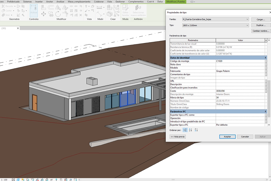 En este proyecto de vivienda unifamiliar desarrollamos un modelo BIM que incorporó información detallada como costes y proveedores de carpinterías. A través de tablas de planificación, estos datos se utilizaron directamente para calcular presupuestos más precisos y reducir imprevistos.